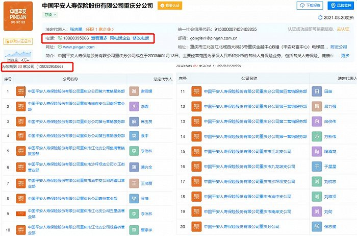 而据天眼查,与该重庆平安留下相同联系方式的还有20家公司,全部为中国平安重庆分公司或支公司的服务部或营业部。