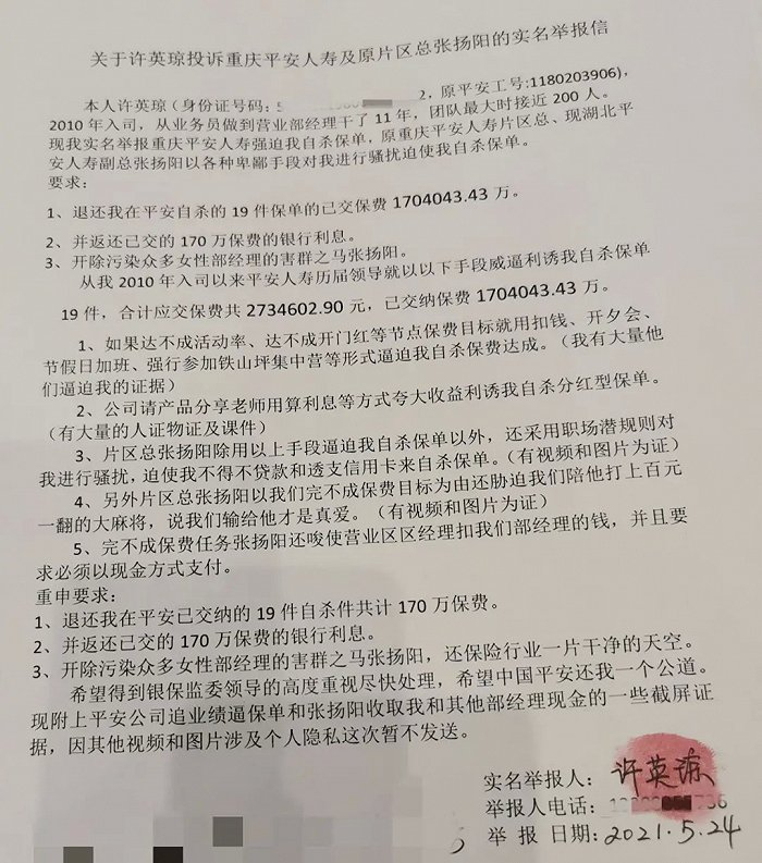 近日,平安人寿重庆分公司11年老员工许英琼实名举报公司以各种手段诱导、逼迫代理人给自己和家人投保19份保单,保费共计273万元的视频火了。