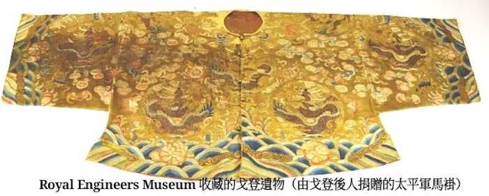太平天国历史博物馆的专家张铁宝先生对天国文物鉴定非常严格,评审了不少天国文物。他认为马褂是由席宝田后人捐赠,有源可考,是天国文物。我也非常认同,并且在多方探索下,从英国Royal engineers museum收藏的常胜军戈登遗物中,找到了同款的太平马褂。此黄缎马褂共绣12团龙,藏品名称:TaiPing riding jacket编号:4801.36.1。这个重大的发现,终于完美解答了沈从文前辈的疑虑,证明了瞻园收藏的是真正的太平天国马褂。