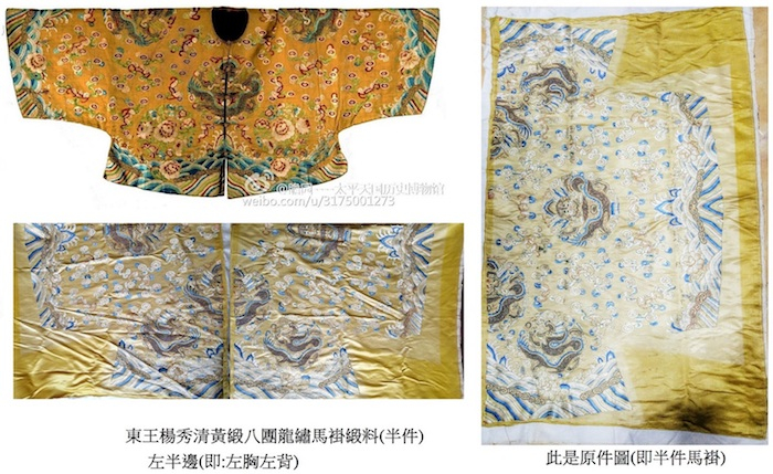 、干王32龙黄袍实物、翼王28龙白袍便服实物,而文献则有《盛川稗乘》记载伪王袍绣龙24条,天将绣龙20条。结合实物与文献,完美展示了每爵级相差4条龙的太平天国龙袍制度。