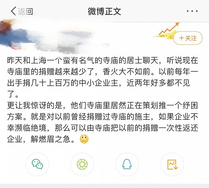 这要从一则微博说起。8月23日,博主“何河有鱼”在微博上表示,和上海一个蛮有名气的寺庙的居士聊天,有些寺庙在策划推一个方案,“对以前曾经捐赠过寺庙的施主,如果企业不幸濒临绝境,那么可以由寺庙把以前的捐赠一次性返还企业,解燃眉之急”。