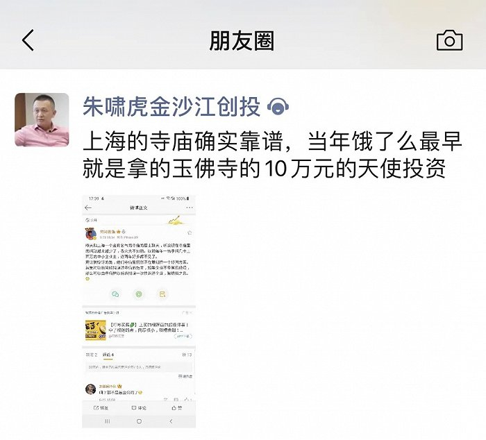 这条微博迅速在互联网发酵,也引来了不少创投圈人士的围观。朱啸虎的一则朋友圈更是揭开了一笔天使投资的隐秘故事,他在朋友圈中提到:“上海的寺庙确实靠谱,当年饿了么最早就是拿的玉佛寺的10万元的天使投资。”朱啸虎是饿了么的早期投资人,他对饿了么的历史了如指掌。