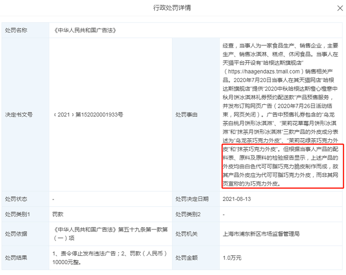 从处罚事由来看,去年7月,哈根达斯旗舰店上发布了数款月饼产品的相关网页广告,广告中提及三款产品的外皮为“巧克力外皮”,但根据产品配料表、原料及原料的检验报告显示,上述产品的外皮均由白色可可脂巧克力脆皮制作而成,故其产品外皮应为代可可脂巧克力外皮,而非网页宣传的巧克力外皮。