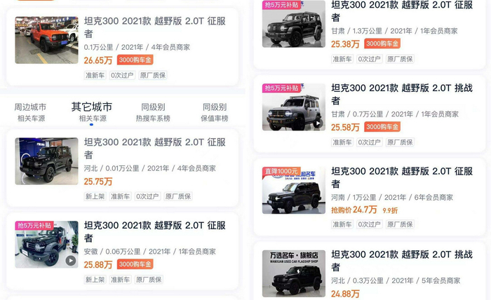 除此之外,据时代财经了解,包括坦克300、路虎卫士等年内“爆款”新车,更出现二手车价格与新车倒挂的情况。以坦克300为例,目前其在某大型二手车门户平台上的报价基本都在24万元以上,与同款车型的新车含税价高出1-3万元不等。