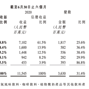 财报显示,农夫山泉包装饮用水产品的营收同比增长25.6%至89.19亿元;茶饮料产品的营收同比增长14.4%至21.82亿元;功能饮料产品的营收同比增长13.2%至20.04亿元;果汁饮料产品的营收同比增长8.1%至12.24亿元;其他产品(苏打水、含气饮料、咖啡饮料、植物酸奶等)的营收同比增长5.5%至0.85亿元。