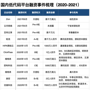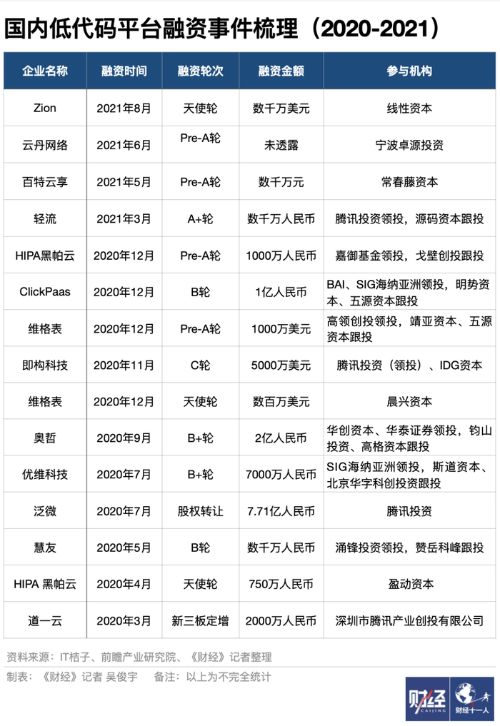 高瓴、IDG、华创资本等投资机构将低代码视为投资赛道。《财经》记者不完全统计,2020年1月-2021年8月,至少有15家低代码平台获得了超过25家主流机构的投资。《财经》记者得到的消息是,下半年资本层面投资热度依旧不减,还有已获融资的企业将拿到新一轮融资。