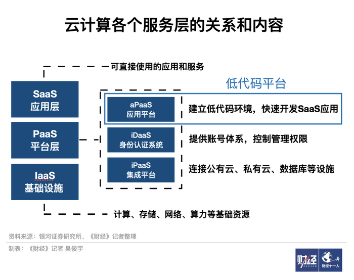 从产品层面上说,低代码是PaaS层的组成部分,价值在于建立低代码环境,快速开发SaaS应用。因此低代码平台也被称为aPaaS平台。