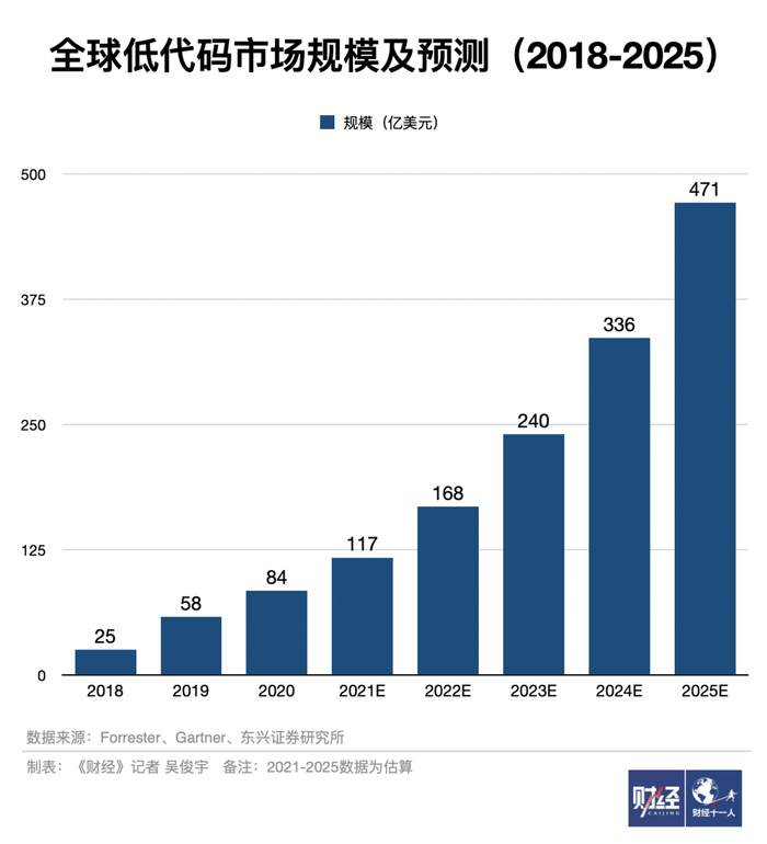 Gartner数据显示,全球低代码市场规模在2020年达84亿美元,预计在2021年超过百亿美元。2025年全球低代码市场规模将达到471亿美元,复合增长率将达到 41%。