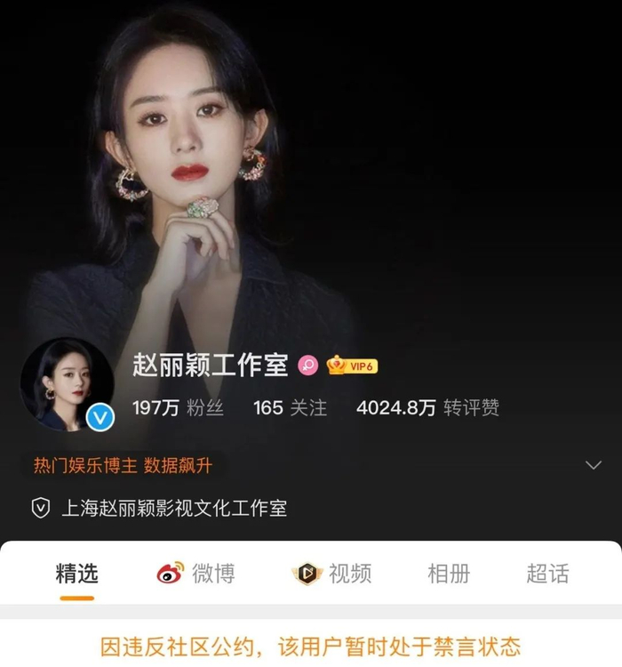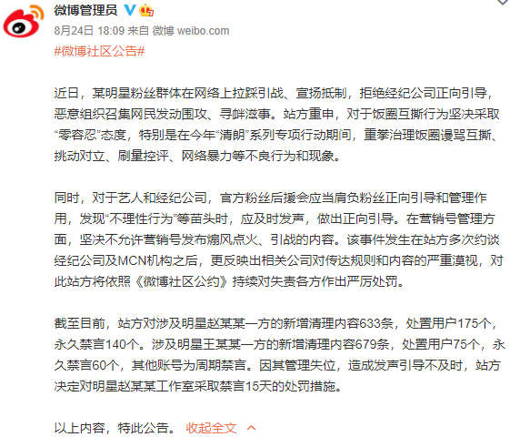 8月24日晚18时,@微博管理员 发布公告称,因其管理失位,造成发声引导不及时,站方决定对赵丽颖工作室微博官方账号采取禁言15天的处罚措施。