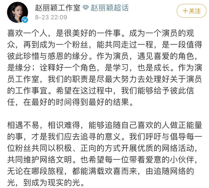 在赵丽颖全球粉丝后援会官方账号显示“永久禁言”后,赵丽颖工作室终于针对这起事件正式发声。