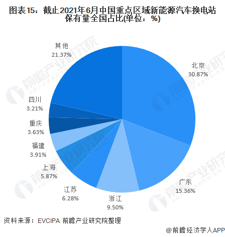 电动汽车充换电方面,根据中国电动充电基础设施促进联盟(充电联盟:EVCIPA)统计数据,显示截至2021年6月,我国换电站保有量总计716座,较2020年增加161座。分省市来看,排名前十的地区占据全国换电站总量的78.63%,其中北京、广东、浙江换电站保有量占比分别为30.87%、15.36%和9.5%分别排放前三,值得注意的是,北京市新能源汽车产量27.76%占据全国30.87%的换电站份额。