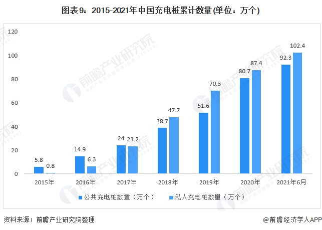 根据中国电动汽车充电基础设施促进联盟发布数据,截至2020年12月底,全国充电基础设施累计数量为168.1万个,其中,公共充电桩数量为80.7万台,私人充电桩数量为87.4万台。截至2021年6月,联盟内成员单位总计上报公共类充电桩92.3万个,私人充电桩102.4万个。