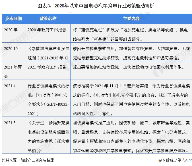 2020年至今,在2021年政府工作报告中,提出要增加停车场、充电桩、换电站等设施,加快建设动力电池回收利用体系;2021年4月30日,市场监管总局批准发布行业首份换电模式的标准:GB/T 40032-2021《电动汽车换电安全要求》;同时,2021年5月,国家发改委、国家能源局发布《关于进一步提升充换电基础设施服务保障能力的实施意见(征求意见稿)》,其中提出将加快换电模式推广应用。可以看出,在国家大力新能源汽车产业的背景下,预计随着行业标准的出台、国家政策的支持和市场的创新驱动,电动汽车换电行业或将迎来真正的“春天”。