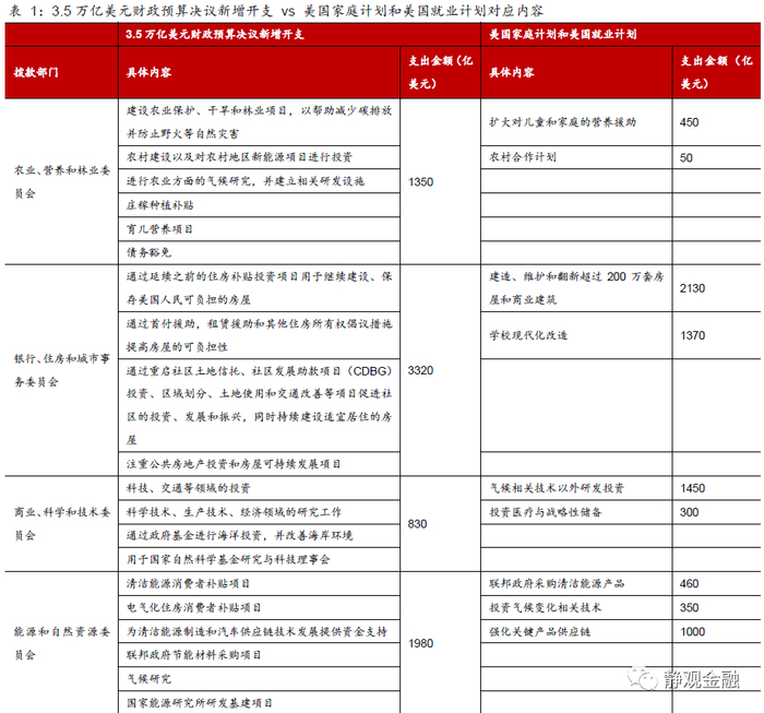 此外,表1-2所示的两项法案,也即:《投资美国法案》及或于2022财年推动的3.5万亿美元预算案基本以“就业计划”及“家庭计划”为蓝本。假若上述政策可按预期落地,则美国政府将在未来给予新能源领域约3770亿美元财政支持、给予传统基建约3740亿美元财政支持。