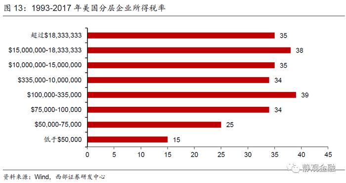 1)将联邦企业所得税率从21%提升至28%。这一调整的力度不会有特朗普减税的力度大。尽管特朗普税改之前美国实施的是15%-39%的分层税制,但可以看出仅有75000万美元以下的年收入部分才可以享受15%和25%的税率,占比很小,其余公司所得税率都达到34%以上。因此特朗普税改一次性将税率降至21%的力度是非常大的。而拜登加税幅度不及特朗普税改减税幅度,影响也会有所削弱。