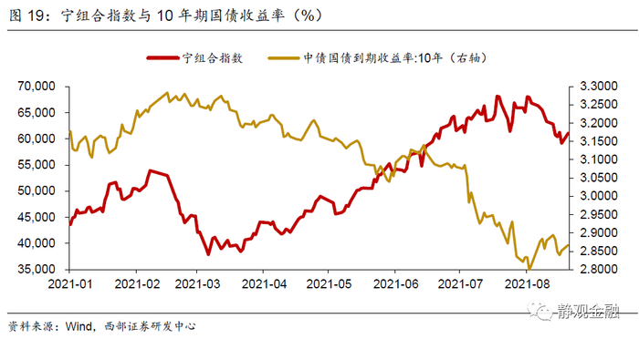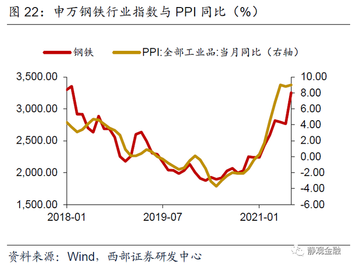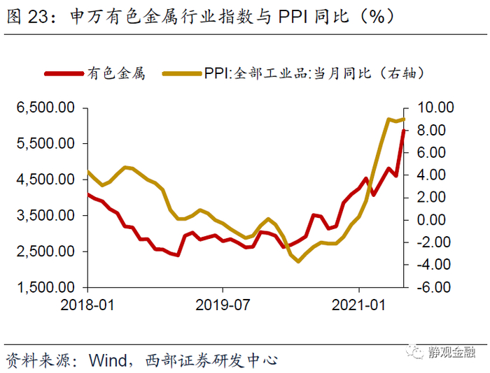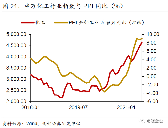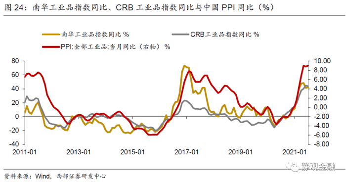 由于社融增速相对经济增长大约有两个季度的时滞,因此年内中国经济大概率持续放缓。南华工业品指数同比与CRB工业品指数同比大约领先中国PPI同比两个月,5月南华工业品指数同比为48.2%,6-7月明显低于5月,8月截至20日的均值相对去年同期增幅较7月进一步下滑。叠加基数效应看,5月大概率为南华工业品指数同比的年内高点。不过CRB工业品指数同比高点或在6月。进而国内PPI同比大概率在Q3见顶,不排除7月就是高点,且Q4存在明显的回落压力。
