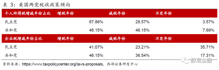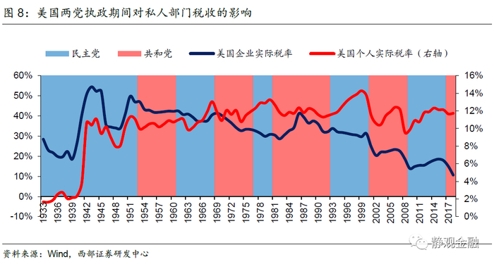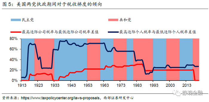 民主党执政期间往往会扩大个人及企业最高边际税率与最低边际税率的差值以维护中小企业和低收入者利益;相反,共和党执政期间总是收缩个人及企业最高边际税率与最低边际税率的差值。简言之,民主党“追求公平”;共和党“追求效率”。