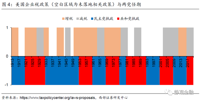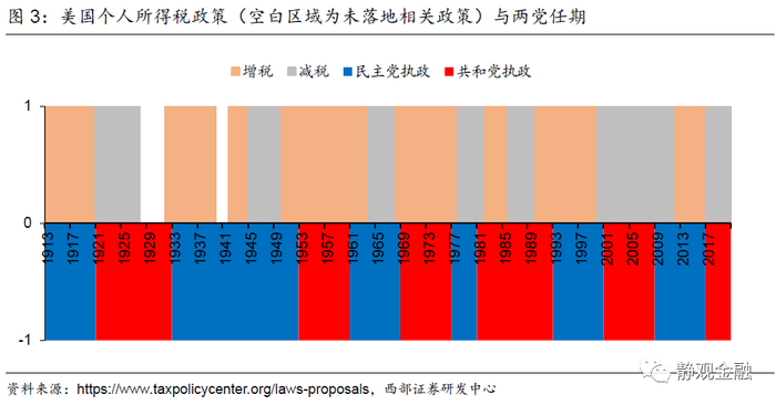 民主党崇尚自由,关注民生,其执政理念偏向“大政府”;共和党偏向保守,推崇“小政府”的执政理念。一战后民主党任期内个税减税年份数占比为28.57%、加税年份数占比为67.86%,企业税减税年份数占比23.21%、加税年份数占比为41.07%。一战后共和党任期内个税减税年份数占比为46.15%、加税年份数占比46.15%,企业税减税年份数占比为36.54%、加税年份数占比为46.15%。整体而言,民主党倾向加税、共和党倾向减税。但民主党加税往往针对是资本、企业和高收入群体,可以说民主党的“大政府”理念易于降低美国贫富分化程度;反之,共和党的“小政府”理念往往推动社会效率提升、但也同时加剧贫富分化。