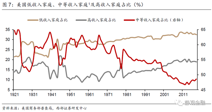 尽管民主党代表“公平”、共和党代表“效率”,但并不意味着每次两党交替执政就是“公平”与“效率”之间的选择。一战后只有两次对于“公平”和“效率”的再选择,分别出现在大萧条后以及1980年。大萧条时代美国贫富分化形势极其严峻,同期美国中产占比也降至50%附近。1932年民主党人罗斯福当选美国总统,不仅执政12年且其继任者也来自民主党,也就是说大萧条后民主党连续执政20年。在美国尽管总统连任是大概率,但接连两任总统来自同一党派则并不常见。由此可见,大萧条不仅令美国社会收入结构失衡、贫富分化形势严峻,也最终推动美国社会进入了“公平”理念主导阶段,民主党政治影响力上升。虽然随后近50年间也不乏共和党人执政,但企业税率及个人税率水平整体较高,此间美国贫富分化形势得到有效缓解、中产家庭占比也升破60%。