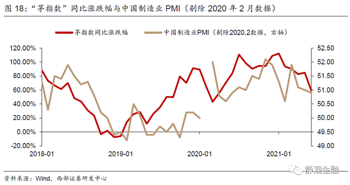 茅指数、宁指数与上游原材料行业指数走势分别以经济增长、无风险利率与PPI同比为锚,那么对于市场整体而言,最差的情形就是经济增速和PPI同比共振放缓的同时无风险利率回升的“两下一上”组合。