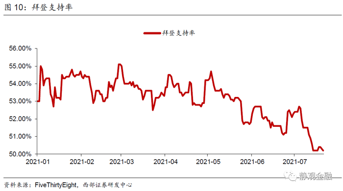 高通胀形势仍未降温,令美国民众对消费前景产生担忧,亦影响拜登民调。4月美国CPI同比升至4.2%、5月为5.0%、6-7月均高达5.4%。通胀走高的同时美国个人耐用品消费支出确实有所回落,尽管这是消费结构由耐用品转向服务的结果,但仍然会令民众产生通胀高企、消费降温的误解。自美国CPI创出金融危机后新高拜登支持率就开始回落,随着通胀持续走高7月底拜登支持率已经降至上任后最低水平。通胀走高与拜登支持率回落的同步既说明高通胀对拜登施政形成掣肘,也反映出高通胀或已影响了民众生活质量并在一定程度上打击了民众对美好生活的向往。