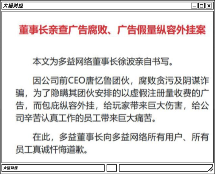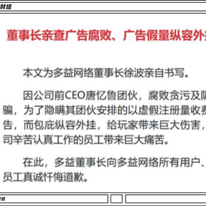 大老板徐波先是跳出来,实名举报公司前CEO唐忆鲁等人包庇纵容外挂,涉嫌每年贪污广告费数亿元。多益网络称将不顾一切代价,誓死彻查唐忆鲁腐败案。
