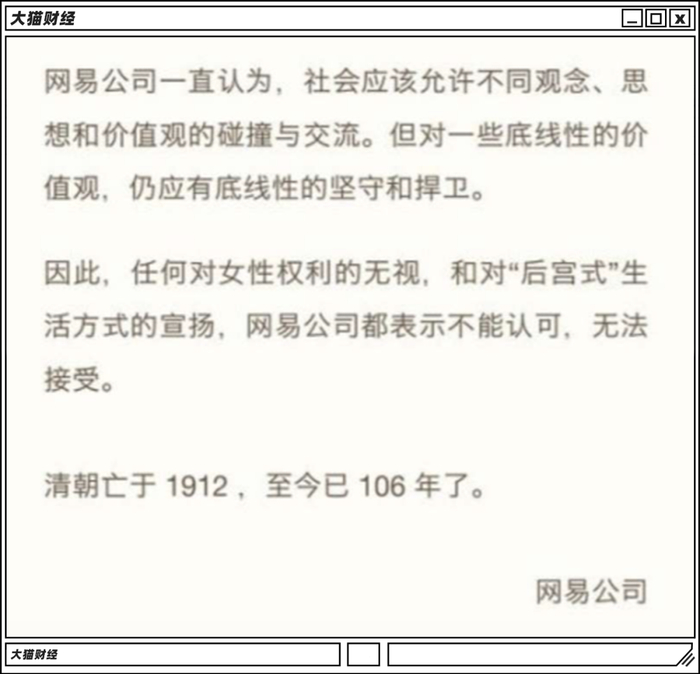 网易在《身家280亿的网易前高管:生12个娃,现实版一夫多妻》这篇文章的回应声明里最后补刀说——清朝亡于1912年,至今已106年了。