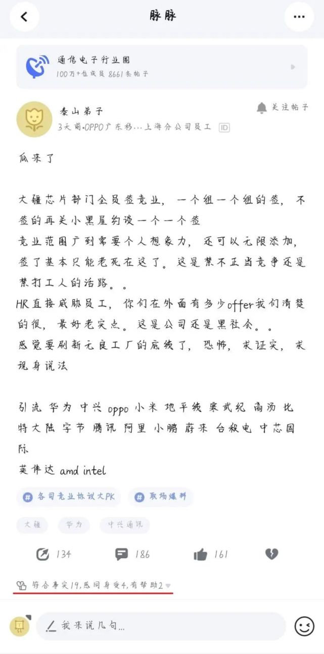 该话题下热门帖子称,“大疆芯片部门全员签竞业,一个组一个组的签,不签的再关小黑屋约谈一个一个签”。对于该帖有19人符合事实,4人感同身受,2人有帮助。
