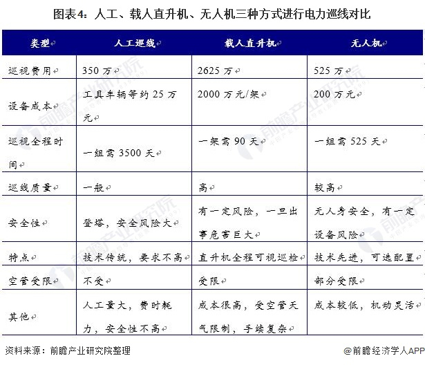 与人工巡线以及载人直升机进行对比,电力巡航无人机在控制成本的基础上保证了巡检的效率及安全性。