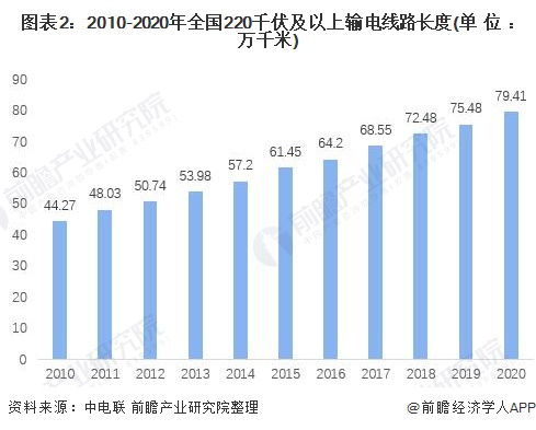 2010-2020年,全国220千伏及以上输电线路长度逐年增长。据中电联数据,截至2020年全国220千伏及以上输电线路回路长度79.41万千米,比2019年同比增长4.6%。
