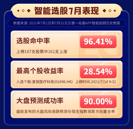回顾艾德一站通7月智能选股历史数据,其中有三个关键数据为选股命中率96.41%、最高个股收益率28.54%、大盘预测成功率90.00%。