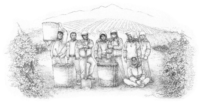 在设计上,“种植者”也独具匠心,不但采用了勃艮第瓶型,更显时尚大气;还精心绘制了一幅葡园种植者群像:丰硕的葡园,质朴的面庞,坚毅和淡定中充满了力量感。以独特的视角,展现出中国葡萄酒种植者的风貌。