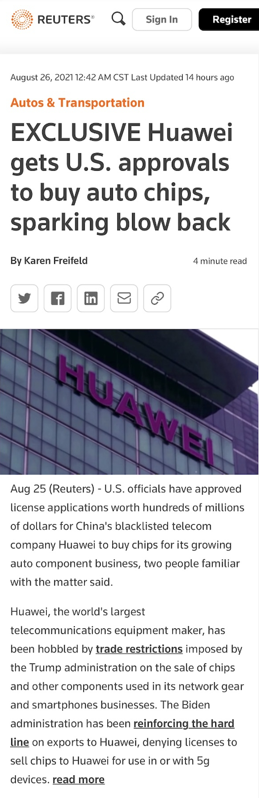 消息称,作为全球最大的电信设备制造商,华为此前曾在网络设备和智能手机业务所需芯片和其他部件方面遭受销售限制,业务受到影响。目前,美国批准当地供应商向华为出售用于屏幕和传感器等汽车零部件的芯片。