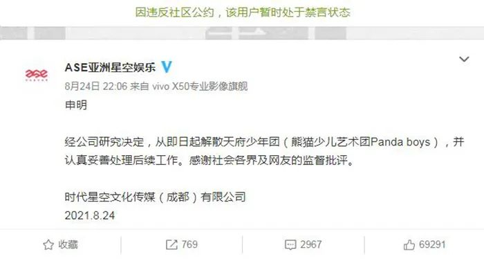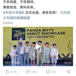 记者注意到,目前该经纪公司的账号暂时处于禁言状态,仅剩下3条关于“天府少年团”的微博。