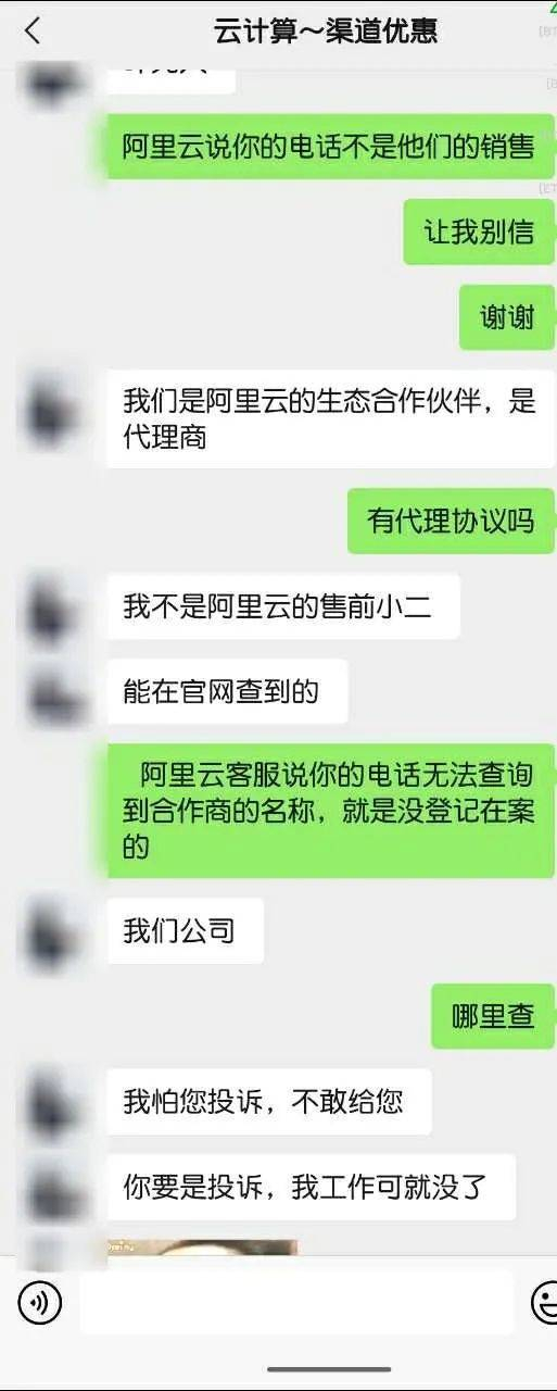 李明表示,之后又多次接到各种不同公司打过来的骚扰电话,“而相同点是推销各种阿里云服务。”有一次李明还加了一个骚扰电话的微信,其向记者提供的聊天截图显示,对方称是阿里云的生态合作伙伴,是代理商,最后还向李明介绍了通过阿里云账号购买产品的方式。