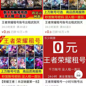 某电商平台首页,输入某个网络游戏的名称,页面也会弹出大量租号、卖号的店铺,“自产自销,无时间限制,数十万账号可选”的广告语充斥其间。在这里,腾讯旗下的《王者荣耀》《英雄联盟》《和平精英》等热门游戏账号都能轻易买到,而且针对微信区和QQ区,苹果和安卓操作系统的手机,都有专属账号。其中,销量超过十万件的时之沙官方旗舰店,“安卓一小时,至尊宝+其他皮肤”的套餐仅标价1.6元。