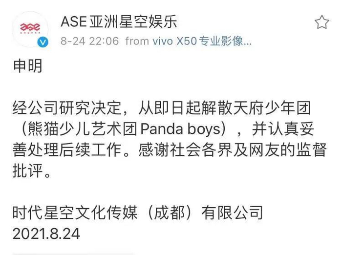 8月24日22时06分,ASE亚洲星空娱乐公司发文称:“经公司研究决定,从即日起解散天府少年团(熊猫少儿艺术团Panda boys),并认真妥善处理后续工作。感谢社会各界及网友的监督批评。”