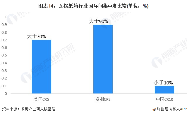 我国前十大瓦楞纸箱企业合计市场份额低于10%,而美国前五大瓦楞纸箱企业占到国内市场份额超过70%,国际间行业集中度比较的结果显示我国瓦楞纸箱行业集中度偏低。