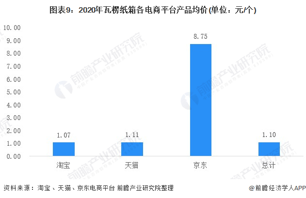 2020年电商平台销售的瓦楞纸箱产品均价为1.1元。其中淘宝最低,为1.07元;天猫略高于淘宝,为1.11元;京东产品均价最高,达到8.75元。