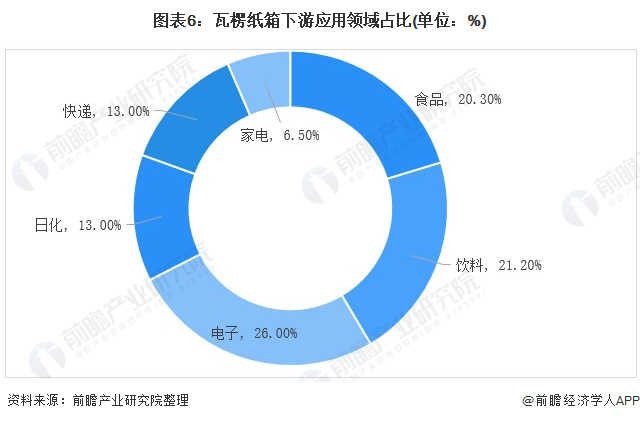 箱板瓦楞纸供给纸箱厂,纸箱厂下游涵盖国内消费(主要为食品饮料及日化用品、家电电子等)及物流运输及出口包装。从行业分布来看,下游电子、食品和饮料用瓦楞包装三者占比为67.5%,快递行业飞速发展促使快递瓦楞包装份额提升。