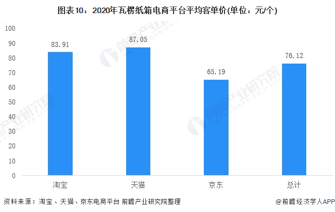 2020年瓦楞纸箱的电商销售平均客单价为76.12元,其中淘宝为83.91元,天猫最高,为87.05元,京东最低,为65.19元。