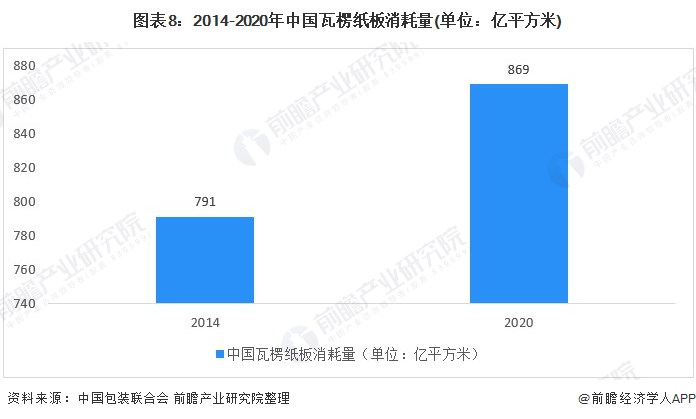从消耗量来看,中国瓦楞纸板市场由2014年的791亿平方米增至2020年的869亿平方米,复合年增长率为1.58%,预计2024年前将将进一步增至949亿平方米,2020年至2024年的年增长率为3.0%。