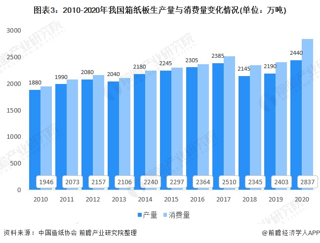 箱纸板又名麻纸板,是一种专供制作外包装纸箱用的比较坚固的纸板。有一般的和高级的两种。表面平滑,色泽淡黄浅褐,有较高的机械强度、耐折性和耐破性,是生产瓦楞纸箱的主要原料。近年来我国箱纸板产量整体处于缓慢增长态势。根据中国包装联合会统计数据,2020年全年,全国箱纸板完成产量2440万吨,消费量2837万吨。