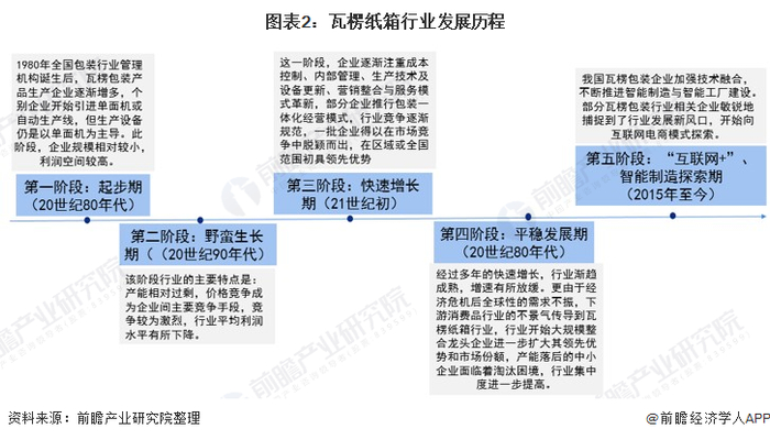 目前,我国瓦楞纸箱行业已形成一个完整、合理的产业系统,从改革开放后开始具体可以概括为以下四个阶段:第一阶段(20世纪80年代)为起步阶段。第二阶段(20世纪90年代)为野蛮生长阶段。第三阶段(21世纪初)为快速增长阶段。第四阶段(2011年起至今)为平稳发展阶段。