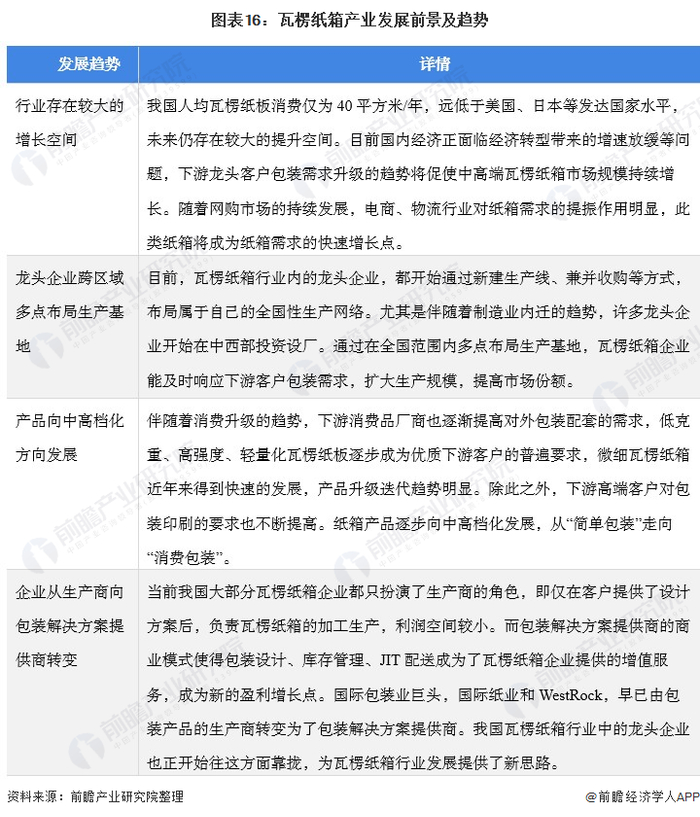 更多行业相关数据请参考前瞻产业研究院《中国瓦楞包装行业市场前瞻与投资战略规划分析报告》,同时前瞻产业研究院还提供产业大数据、产业研究、产业链咨询、产业图谱、产业规划、园区规划、产业招商引资、IPO募投可研、招股说明书撰写等解决方案。