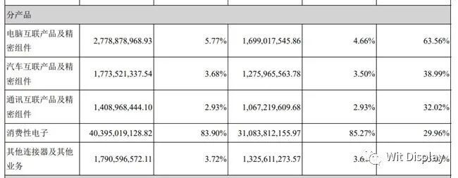 分产品来看,其电脑互联产品及精密组件实现营收27.79亿元,同比增长63.56%;汽车互联产品及精密组件实现营收17.74亿元,同比增长38.99%;通讯互联产品及精密组件实现营收14.09亿元,同比增长32.02%;消费性电子营收403.95亿元,同比增长29.96%;其他连接器及其他业务营收17.91亿元,同比增长35.08%。
