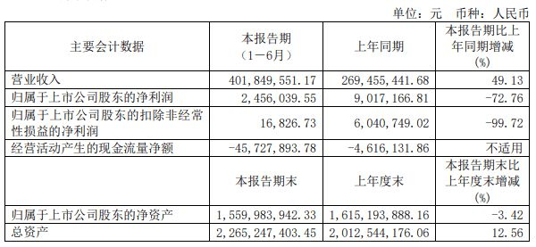 财报显示,今年上半年沃格光电实现的营业收入约4.02亿元,同比增长49.13%;对应实现的归属净利润约245.6万元,同比下降72.76%。报告期内沃格光电实现的扣非后净利润同比下降99.72%。