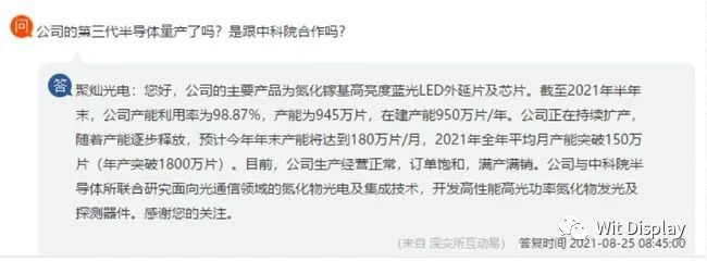 聚灿光电回复称,950万片产能对应向特定对象发行股票的募投项目,于募集资金到位、完成验资后,已投入使用。此外,公司的主要产品为氮化镓基高亮度蓝光LED芯片及外延片。公司与中科院半导体所联合研究面向光通信领域的氮化物光电及集成技术,开发高性能高光功率氮化物发光及探测器件。LED背光具有轻薄化液晶屏幕、提升显示效果及节能省电等特点,使其较传统背光光源有着不可比拟的优势。