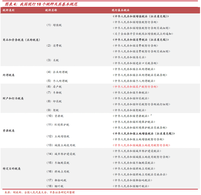 “落实税收法定原则”改革目标基本实现。现行18个税种中,增值税、消费税、土地增值税这3个税种目前均已起草并形成相应税法(《征求意见稿》);城市维护建设税和印花税均已由人大审议并通过立法,但暂未开始施行;房产税和城镇土地使用税目前仍由国务院以暂行条例的形式发布实施,尚处于立法起草阶段;其余11个税种均以国家法律形式立法且已正式发布施行。