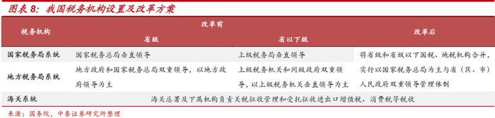 2018年,根据国务院机构改革方案,将省级和省级以下国税地税机构合并,具体承担所辖区域内的各项税收、非税收入征管等职责。国税地税机构合并后,实行以国家税务总局为主与省(区、市)人民政府双重领导管理体制。此外,由海关总署及下属机构负责关税征收和受托征收进出口增值税、消费税等税收。回顾我国分税制改革以来国地税征管体制改革历程,可分为三个阶段:
